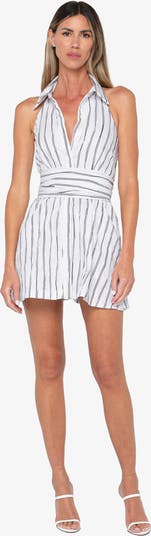 The Tali Dress features a sleeveless halter neckline with a button-front bodice and an adjustable wrap tie sash that cinches the waist. Crafted in striped dobby, it finishes with a softly flared skirt for an easy, feminine silhouette.