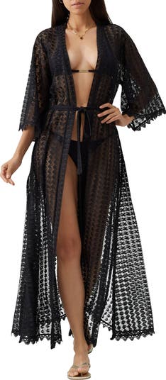 Bring main character energy to your poolside look with this ankle-length cover-up in a sheer, delicate knit and robe-inspired silhouette that ties at the waist.