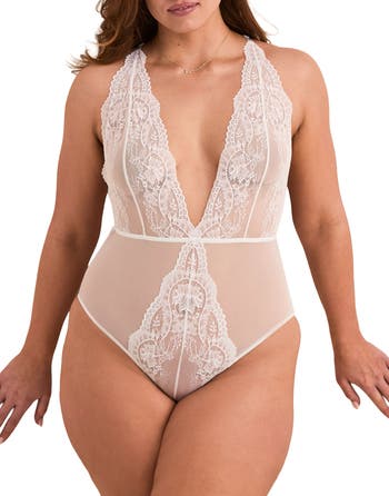 This bodysuit features a mix of lace and mesh with a bold plunging neckline, cheeky fit, and straps down the back. It's perfect for a hot night in.