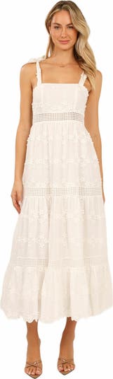 Crafted from lightweight cotton, adorned with embroidered floral print, this stunning dress features flirty tiny cutouts around of the waist. A sophisticated midi hem with a playful side. It's a statement dress for sure. Hidden back zipper.