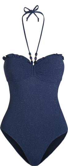 Turn up the glam with the Talia One Piece, a show-stopping silhouette that is equal parts chic and versatile. The elegant bead-trimmed halter tie steals the spotlight, doubling as a necklace that can be worn two ways‚ around the neck for a glamorous halter effect or in a bow for a sophisticated strapless look. It's swimwear that feels like jewelry, adding an extra layer of luxe to your poolside wardrobe. With its flirty ruffle neckline, nipped-in waist, and open scoop back with a ruffle detail, the Talia One Piece creates a flattering, feminine silhouette. The shirring across the torso and smoothing power compression liner offer texture and shape, while hidden boning, molded bust cups, and an adjustable clip back ensure the perfect fit for all-day comfort.