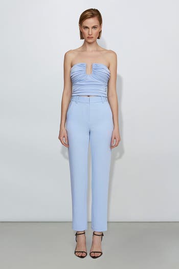 A strapless ruched crop top with a modern front cutout. Stylish and versatile, perfect for dressing up or down.
