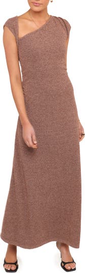 Make a refined and modern statement in this A-line dress complete with cap sleeves and an asymmetric neckline.