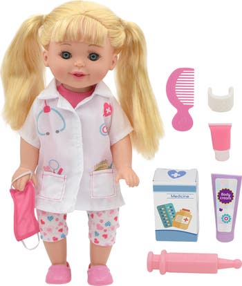 - DETAILED DOCTOR OUTFIT: The 14" doll is dressed in a realistic doctor’s outfit, featuring a crisp white coat over a pink top, heart-patterned pants, matching pink shoes, and a coordinating pink face mask.