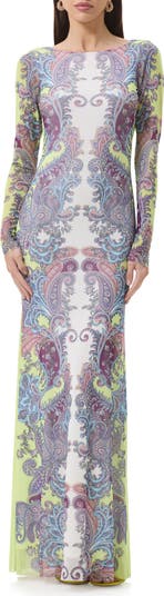 An open back lends skin-baring appeal to a figure-flaunting maxi dress covered in a bold pattern that's sure to have all eyes on you.