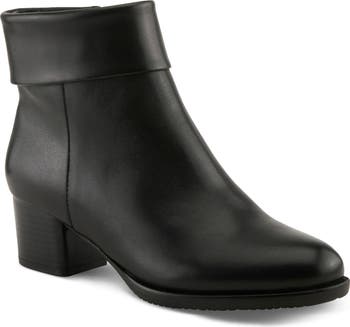 A folded collar adds refinement and dimension to a premium leather bootie set on a low, stacked heel for increased stability and a comfortable lift.