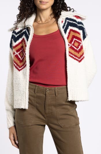 A bold pattern emboldens this fuzzy-textured jacket made with a sporty front zip for easy layering.