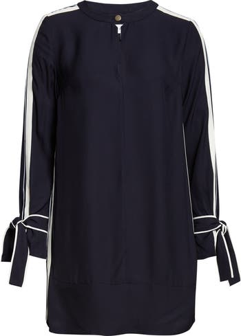 Striped tipping traces the sides of this shift minidress and the length of each sleeve, bringing a crisp, sporty contrast to a relaxed straight fit finished with a keyhole neckline and tie cuffs.