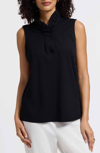 A textural crepe-knit fabrication brings softness and structure to this polished top updated with a ruffled collar and shoulder-baring profile.