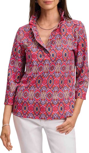 A frilled collar adds a touch of charm to this jersey top covered in a boho-inspired tile print for a look that moves stylishly from 9-to-5 and beyond.
