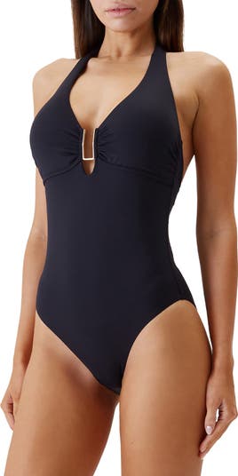 A structural goldtone wire gives a deeply dipped front to this halter-neck one-piece swimsuit.