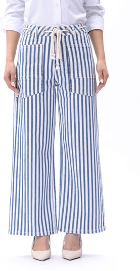 Vertical stripes and a rope-inspired drawstring lend nautical appeal to wide-leg jeans cut from low-stretch denim.