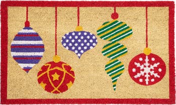 Welcome your guests in style with our ornament coir Christmas doormat! This doormat is made of durable coir fiber that effectively removes dirt and moisture from shoes. Printed with 5 different types of Christmas ornaments in vibrant colors, this doormat is the perfect addition to your holiday decor. Its festive design adds a touch of warmth and cheer to your doorstep, making it the ideal way to greet your guests during the holiday season. Order now and give your entrance the festive boost it deserves! Product Features: Christmas ornament outdoor mat Features five different styles of Christmas ornaments hanging from red cords Tufted and bleach printed mat Non-skid backing helps to keep your doormat securely in place Heavy-duty construction for lasting durability Coir is eco-friendly, resistant to fungi, resilient, static-free, fast drying and easy to clean Recommended for both indoor and outdoor use Care instructions: rinse with a hose and air dry Dimensions: .75"H x 18"W x 30"L Material(s): rubber/coir