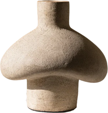 The Tanah vessel is an elegant terracotta sculpture handmade by local Indonesian artisans. The vessel's name comes from the marvelous Tanah lot, an ancient Hindu temple dedicated to the gods of the sea. Its pristine shell-white color gives a beachy feel, while its interesting shape that resembles a hut is a callback to coastal living. This beautiful sculpture is the perfect addition to any room, desk or counter, a fusion of functionality and creativity crafted using techniques that have been passed down through generations. Use it as a vase for your dry stem or as a standalone display.