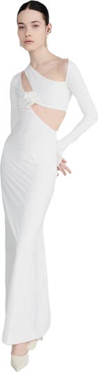Our Tanaro long dress represents the playfulness and flirty qualities of the brand. With long, smooth sleeves and asymmetric cutouts that play over the body, this dress is the perfect showstopper rounded up with a blossoming 3D handmade flower, characteristic of Maygel Coronel's eternal summer dream aesthetic.