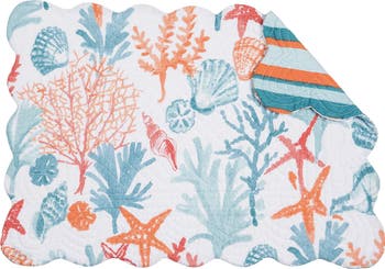Take a vacation on the Tangerine Coast with this table linen collection. This quilted cotton placemat's vibrant design of blue and orange coral, starfish, and seashells gives your table a tropical feel, and reverses to a coordinating beach towel stripe that is perfect for any summer meal.
