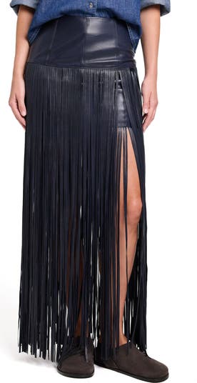 Floor-grazing fringe brings dramatic movement to this supple leather skirt designed with a smooth, fitted waist.