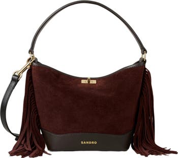 Mini TANGOSO suede and leather bucket bag with fringes on the sides, featuring a swivel clasp, handle for shoulder or hand carrying, and removable shoulder strap for crossbody wear.