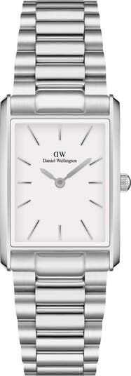 A curved rectangular case seamlessly integrates with the stainless steel bracelet of this quartz-powered timepiece boasting clean, minimalist stick indexes.