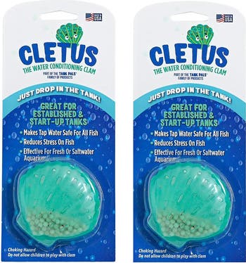 WATER CONDITIONING: 2 PK - CLETUS, BLUE - Cletus the water conditioning clam is great for established and started tanks. CONDITIONS & MAKES TAP WATER SAFE: Drop Cletus into your tank before filling with tap water. He acts as a high-performance chlorine neutralizer and water conditioner for fish tanks, emphasizing the crucial role of safe and optimal conditions for fish health. He promotes vibrant aquatic life and performs important housekeeping for the rest of your aquarium critters. His function is also a great compliment to his other Tank Pal friends. ELIMATES CHLORINE, CHLORAMINES, AND HEAVY METALS: Cletus stealthily disarms chlorine and chloramines, which are harmful to your aquatic gang. He also controls heavy metals and provides crucial nutrients to support a thriving aquatic environment. Performing these functions is crucial to preventing fish stress and maintaining clean water, ensuring the well-being of the entire aquarium ecosystem. HOW IT WORKS: Cletus operates on a dual approach: equipped with a high-capacity adsorbent material, he efficiently removes heavy metals upon contact. Additionally, he carries active beads that neutralize harmful chlorine and chloramines as well as release important nutrients into the water, ensuring a comprehensive and effective fish tank water treatment solution. WORKS WITH 2 HOURS AND CANNOT BE OVER-DOSED: Cletus is designed for extended performance, he acts quickly and is versatile. He seamlessly works in both freshwater and saltwater environments, providing long-lasting water quality enhancement for diverse aquatic setups. Follow directions for proper use. The active beads within Cletus are inherently safe, posing no threat to the well-being of fish, plants, turtles, shrimp, and other invertebrates living in the aquarium. Their composition ensures a gentle yet effective aquarium water treatment, promoting a harmonious aquatic environment without any adverse effects on the inhabitants.