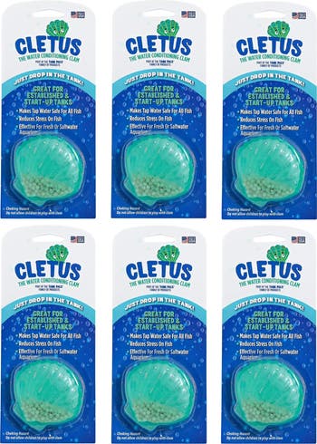 WATER CONDITIONING: 6 PK - CLETUS, BLUE - Cletus the water conditioning clam is great for established and started tanks. CONDITIONS & MAKES TAP WATER SAFE: Drop Cletus into your tank before filling with tap water. He acts as a high-performance chlorine neutralizer and water conditioner for fish tanks, emphasizing the crucial role of safe and optimal conditions for fish health. He promotes vibrant aquatic life and performs important housekeeping for the rest of your aquarium critters. His function is also a great compliment to his other Tank Pal friends. ELIMATES CHLORINE, CHLORAMINES, AND HEAVY METALS: Cletus stealthily disarms chlorine and chloramines, which are harmful to your aquatic gang. He also controls heavy metals and provides crucial nutrients to support a thriving aquatic environment. Performing these functions is crucial to preventing fish stress and maintaining clean water, ensuring the well-being of the entire aquarium ecosystem. HOW IT WORKS: Cletus operates on a dual approach: equipped with a high-capacity adsorbent material, he efficiently removes heavy metals upon contact. Additionally, he carries active beads that neutralize harmful chlorine and chloramines as well as release important nutrients into the water, ensuring a comprehensive and effective fish tank water treatment solution. WORKS WITH 2 HOURS AND CANNOT BE OVER-DOSED: Cletus is designed for extended performance, he acts quickly and is versatile. He seamlessly works in both freshwater and saltwater environments, providing long-lasting water quality enhancement for diverse aquatic setups. Follow directions for proper use. The active beads within Cletus are inherently safe, posing no threat to the well-being of fish, plants, turtles, shrimp, and other invertebrates living in the aquarium. Their composition ensures a gentle yet effective aquarium water treatment, promoting a harmonious aquatic environment without any adverse effects on the inhabitants.