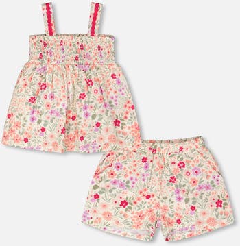 Our tank top with smocking and shorts set in muslin off white with printed flowers is light and playful for warm summer days. The sleeveless top features adorable straps and a smocked bodice that flows into a flared cut, while the matching shorts come with an elastic waistband for comfort. Adorned with a delicate allover floral print, this airy cotton set is perfect for little girls exploring sunny meadows.