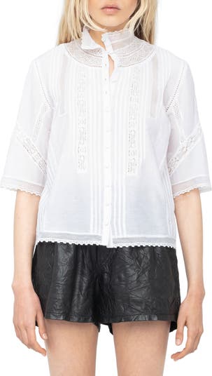 Lace details sweeten the style story of this button-up cut from an airy cotton blend that makes the most of the relaxed fit inspired by roomy shirts in his closet.