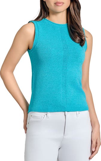 Supersoft tape yarn with a flat, ribbon-like appearance brings subtle texture to this sleeveless sweater that's simply detailed with front and back contrast stitching.
