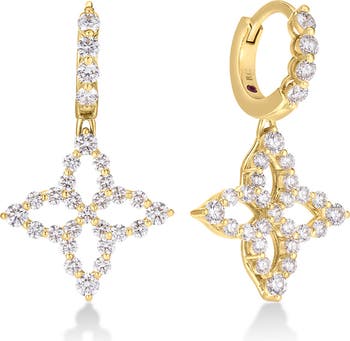 Brilliant round-cut diamonds dazzle amid floral motifs on these 18-karat gold earrings inspired by the Gothic arches of Venetian architecture. Each Robert Coin creation hides a small ruby as a quiet token of good fortune.