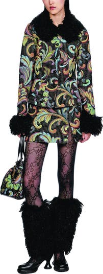The Tapestry Faux Fur Jacket is a bold and colorful piece that will add a pop of vintage fun to any wardrobe! It features an intricate multicolored design woven into a rich black background, with black faux fur trim throughout the jacket, adding a fun texture to contrast the sophisticated print.