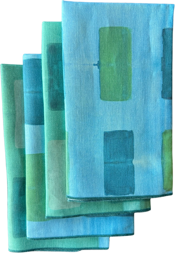 Meet the Blue Tapestry Napkin—where abstract art meets your dinner table. Inspired by bold brushstrokes and beautiful colors, this print bursts with color and creative energy. The colors are joyful and will transform an ordinary meal into something special. Depending on where the linen is cut, each piece is unique and has a different ratio of turquoise and seafoam green. Each napkin is a piece of a larger painting. 18x18 inches; Set of 4 100% European linen Designed in NYC, Made in Portugal Machine wash cold, lay flat to dry. Iron or dry clean optional.