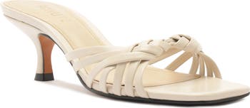 Interlaced straps bring dynamic texture to the vamp of this modern slide sandal balanced on a tapered kitten heel for contemporary flair.
