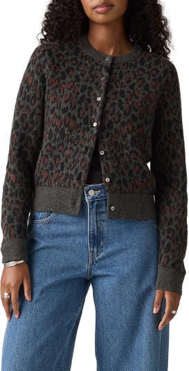 Striking animal spots embolden this close-fitting crewneck cardigan knit from a warm wool-kissed blend.