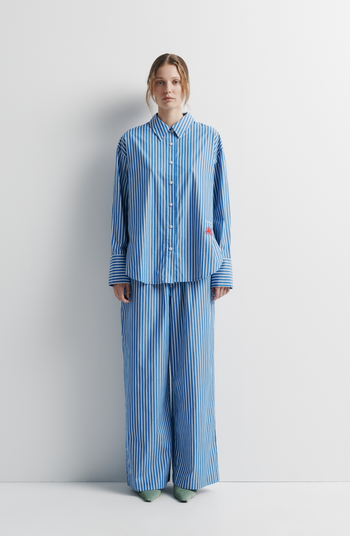 A oversized long-sleeve shirt crafted from 100% cotton, detailed with a high–low hem, oversized cuffs, and custom Romy embroidery.