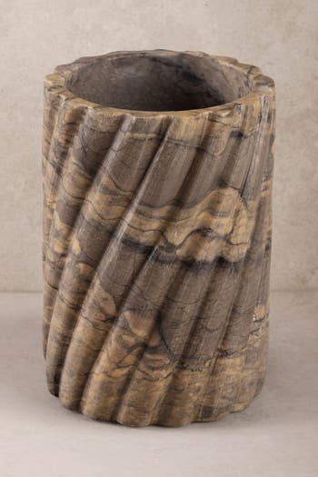 The Taraz Onyx Wine Chiller, crafted from exquisite hazel brown and ivory white onyx marble, brings a touch of sophistication to your gatherings with its elegant fluted design. Handcrafted in India, this ribbed masterpiece showcases the artistry and dedication of skilled artisans, making each piece truly unique. Perfect for chilling your favorite wines, it serves as both a functional accessory and a striking decor element. Own this exclusive chiller and celebrate the beauty of sustainable craftsmanship in your home.
