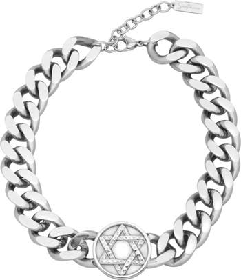 This chunky chain choker made from stainless steel is plated in tarnish-resistant rhodium for long-lasting polish. It's centered with a hammered Star of David plaque that reverses to display a powerful slogan.