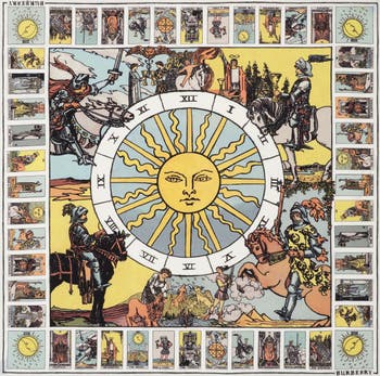 A scarf made in Italy from silk poplin. Reimagining Edwardian tarot cards, the style is printed with esoteric designs inspired by British artist Pamela Colman Smith. ||Square|Hand-rolled edges|Printed Burberry lettering