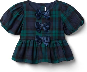 Bows upon bows for our festive tartan top. Featuring a peplum silhouette with puff sleeves too.
