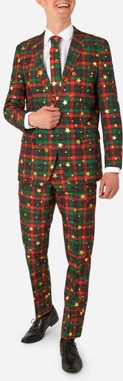 Festive, fancy and a whole lot of fun, this holiday-plaid suit covered in golden stars features a slim profile that's fitted in the waist for a traditional look that's more at home in celebratory settings. It comes with flat-front trousers and a matching tie to keep you looking as coordinated as you are colorful.