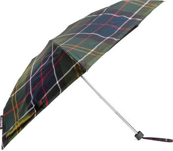 This full-size umbrella features a signature tartan plaid for a classic take on a timeless essential. With a smooth wooden handle and generous canopy, it keeps you covered in style when the forecast is dreary. A black coating on the inner canopy provides added sun protection.