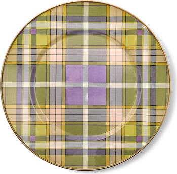 A little burst of color for your shelf or counter top, this hand-glazed plate is crafted from sturdy, heavy-gauge steel and finished in a lively violet-and-green tartan pattern.