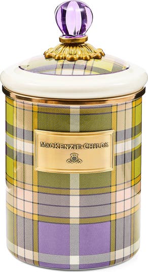 A little burst of color for your shelf or counter top, this hand-glazed canister is crafted from sturdy, heavy-gauge steel and finished in a lively violet-and-green tartan pattern. Topped with a glossy purple glass knob, it's perfect for stashing everything from sugar or flour to birdseed or dog treats — with plenty of personality to spare.