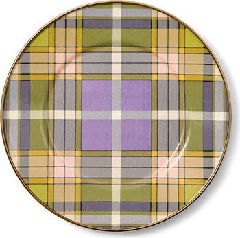 A little burst of color for your shelf or counter top, this hand-glazed plate is crafted from sturdy, heavy-gauge steel and finished in a lively violet-and-green tartan pattern.