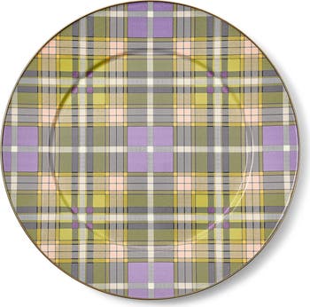 A little burst of color for your shelf or counter top, this hand-glazed platter is crafted from sturdy, heavy-gauge steel and finished in a lively violet-and-green tartan pattern.