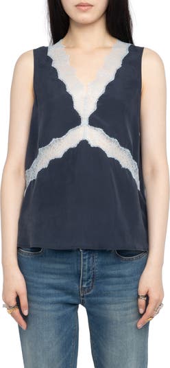 Intricate lace brings textural contrast and peekaboo allure to a sleeveless V-neck top cut from lustrous silk. A subtle embroidered wings motif at the back finishes the look with a dash of signature style.