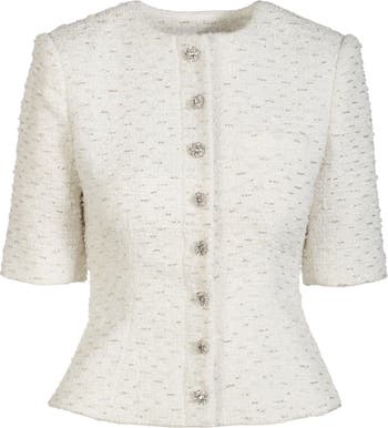Refined and feminine, the Tashi Tweed Jacket is a modern classic. Crafted in textured cream tweed, this tailored silhouette features short sleeves, a subtle peplum waist, and crystal statement buttons for a polished finish. Perfect for pairing with skirts or trousers, it’s a versatile piece that transitions seamlessly from office chic to evening elegance.