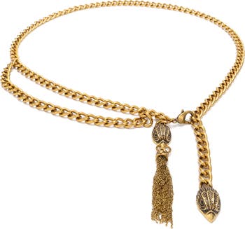 Tassels and the brand's eagle-head icon sway from this golden chain-link belt that you can adjust to wear high on the waist or low on the hips.