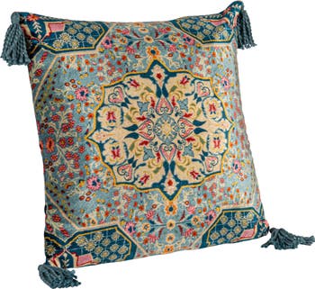 This 20-inch Square Pillow is a fusion of bohemian spirit and luxurious comfort. The cotton blend velvet surface is printed with a vibrant, vintage carpet pattern that brings a global sensibility to any space. Tassels on each corner add a playful touch, enhancing the pillow's eclectic charm. The viscose in the fabric mix gives it a subtle sheen, while the polyester filler provides p support, making it both a decorative and practical addition to the home. Whether it's gracing a couch, chair, or bed, this pillow invites the to embrace its boho-transitional style and sink into its soft embrace.