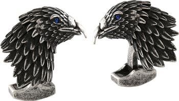 Sparkling Swarovski-crystal eyes add a touch of color to triumphant cuff links with an oxidized finish.