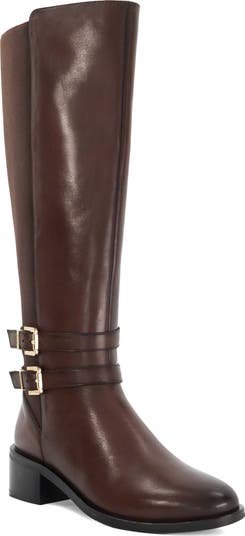 Buckled ankle straps create an equestrian-inspired aesthetic on a knee-high leather boot fitted with an elasticized back panel and stacked heel for modern intrigue.